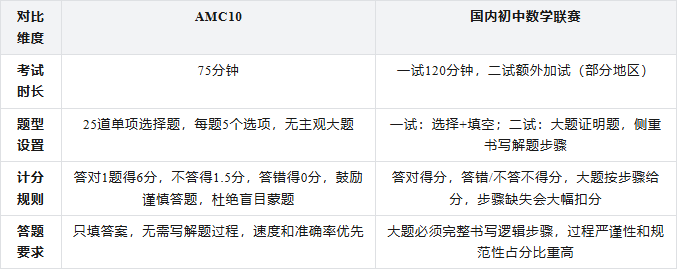 简单来说:AMC10是客观题速战速决,拼思维速度和选项排除技巧;初中联赛是客观+主观结合,拼步骤严谨性和大题推导能力,粗心和步骤不规范很难拿高分