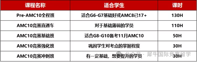 2026 年 AMC10 数学竞赛备考的同学看这里!不管你是完全零基础、没有任何参赛经验,还是之前参加过但发挥不佳,犀牛教育都开设了针对性的 AMC10 培训课程,包含 Pre-AMC10 和 AMC10 两种班型,帮大家稳步提升数学竞赛水平。