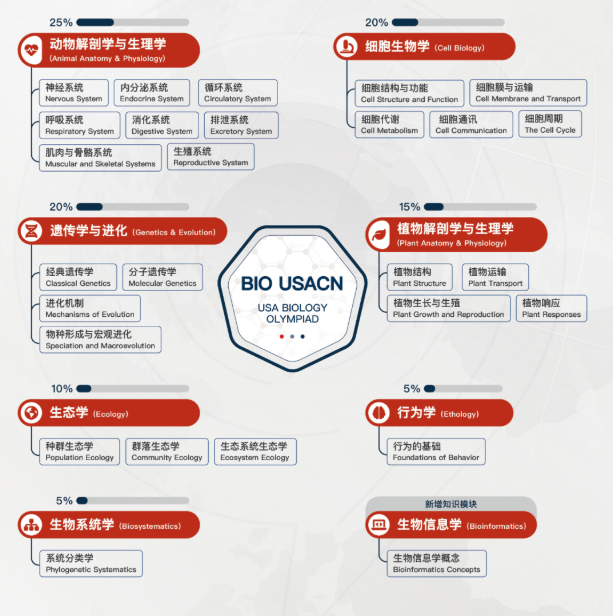 USABO考察内容并不局限于AP Biology,而是大学普通生物学(General Biology)+ 拓展内容,重点包括: