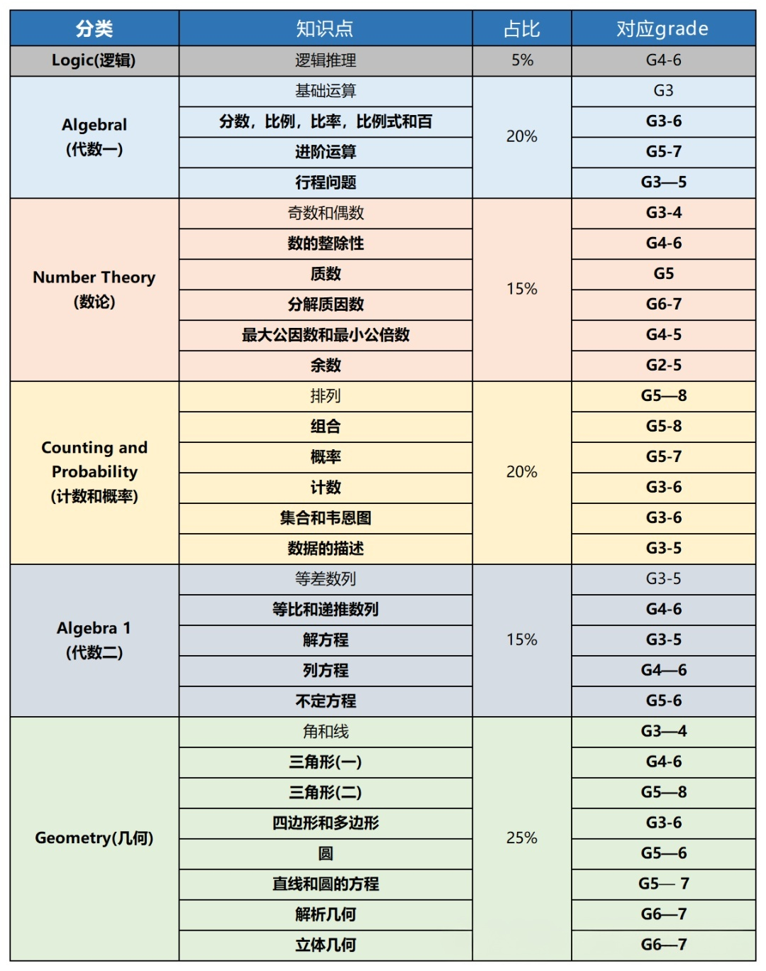 AMC8的知识点覆盖小学全阶段+初中部分内容,核心分为四大模块,分别是:
