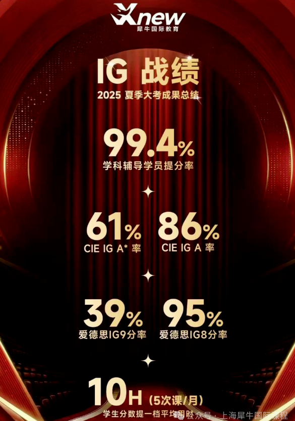 2025年夏季大考中,犀牛学员IGCSE提分率高达99.4%,其中CIE考试局A*率达61%,A率达86%;Edexcel考试局9分率达39%,8分率达95%,远超全球行业水平。