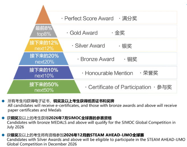 金奖和银奖获得者可直接晋级新加坡国际数学挑战赛(SIMOC)和国际青少年数学奥林匹克(IJMO),铜奖获得者可通过附加赛争取SIMOC晋级资格。