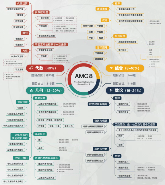 很多学生备考AMC8盲目刷题,效率极低,核心原因是没抓住AMC8高频考点。AMC8竞赛考点固定,主要分为四大核心模块,占比清晰,针对性攻克高频考点,能大幅提升备考效率,少走弯路,这也是新手AMC8备考的核心抓手。