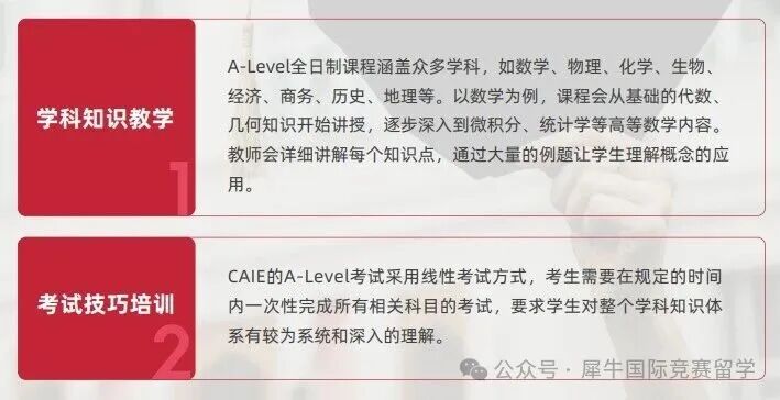 想冲海外名校,选 A-LEVEL 但不知道怎么学?怕学科跟不上、雅思拖后腿、申请没头绪?别愁!犀牛教育的 A-LEVEL 全日制课程直接一站式搞定!不管是学科提分、语言冲刺,还是留学规划、背景提升,从学习到申请全链路陪跑,帮你稳稳拿下亮眼成绩,圆梦世界百强名校!
