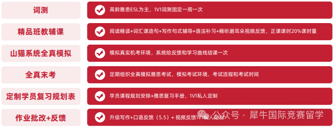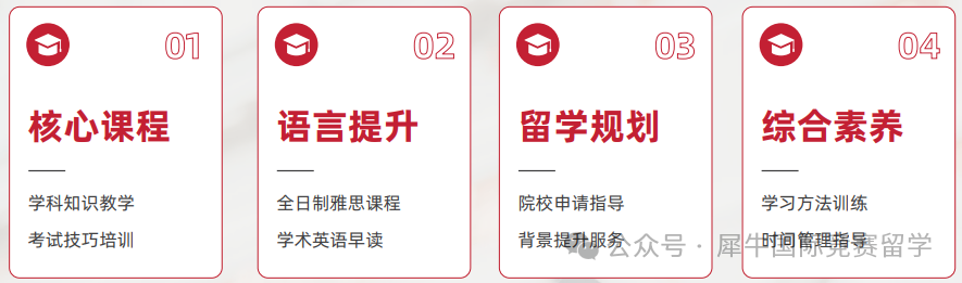 犀牛 A-LEVEL 全日制构建核心课程 + 语言提升 + 留学规划 + 综合素养四大核心板块,拒绝单一教学,实现知识、能力、申请全方位提升,让学生不仅能考出高分,更能匹配名校申请的综合要求!