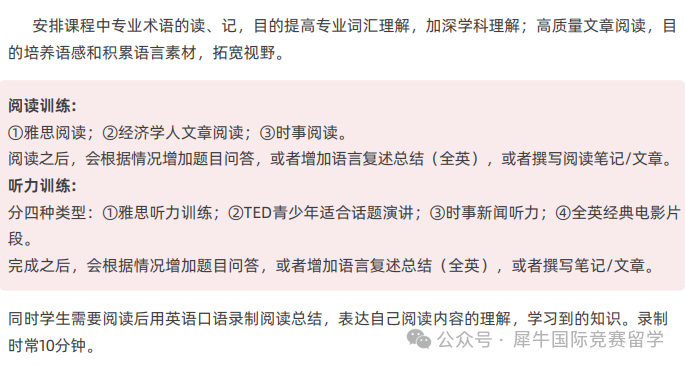 作为犀牛核心优势板块,一方面提供国际竞赛辅导,针对理工科、商科 / 文科匹配对应竞赛,以竞赛获奖彰显学术实力;另一方面开设EPQ 课程,该项目为 UCAS 强烈推荐,罗素集团大学高度认可,助力学生提升研究与独立学习能力,为名校申请加码