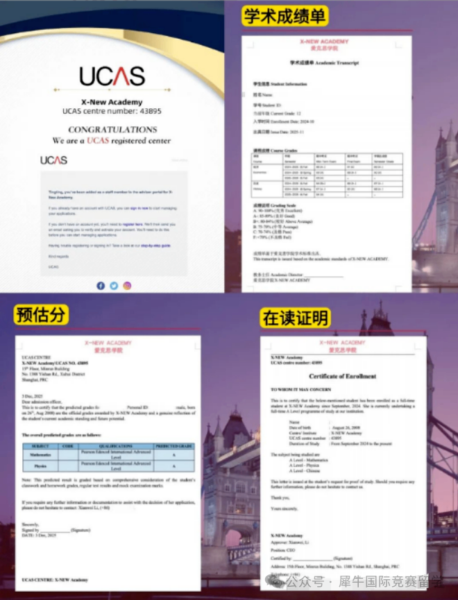作为拥有正规 UCAS 中心编号的官方注册机构,犀牛能够为学生开具被海外院校广泛认可的预估分、在读证明与推荐信,这是许多同类机构难以实现的核心优势。我们还提供从选校定位、文书打磨、面试指导到申请材料整理的全流程服务,全程陪伴学生走完英国本科申请的每一步