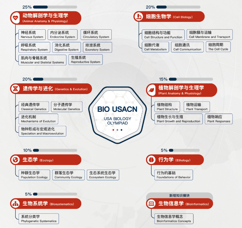 USABO的考察范围远超高中生物课程,深度对标AP Biology+大学General Biology,2025年起还新增了神经生物学(Neurobiology)和生物信息学(Bioinformatics)两大前沿模块。