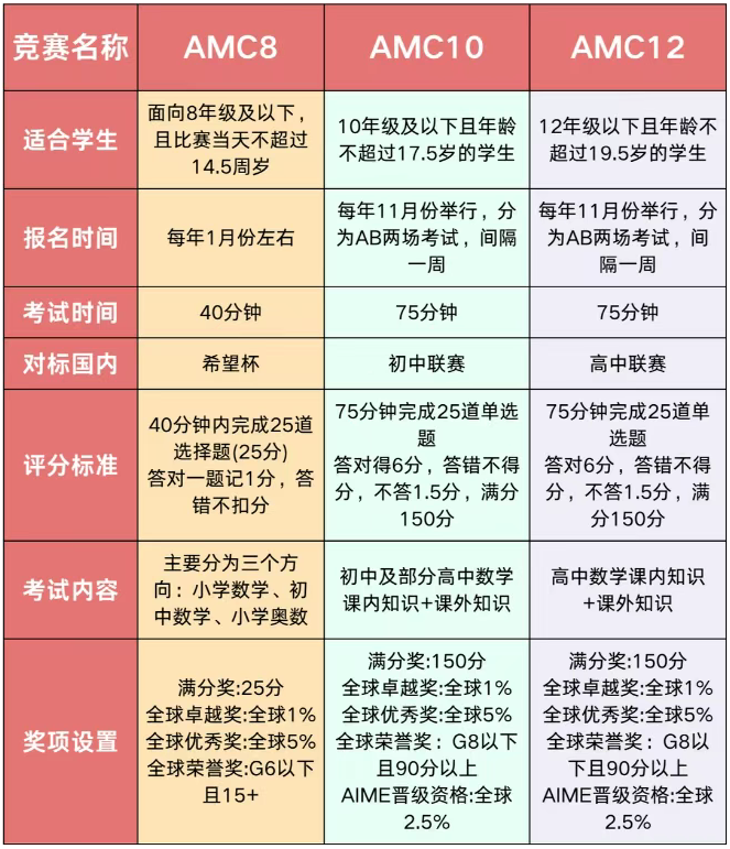 AMC竞赛主要包括AMC8、AMC10、AMC12、AIME,
