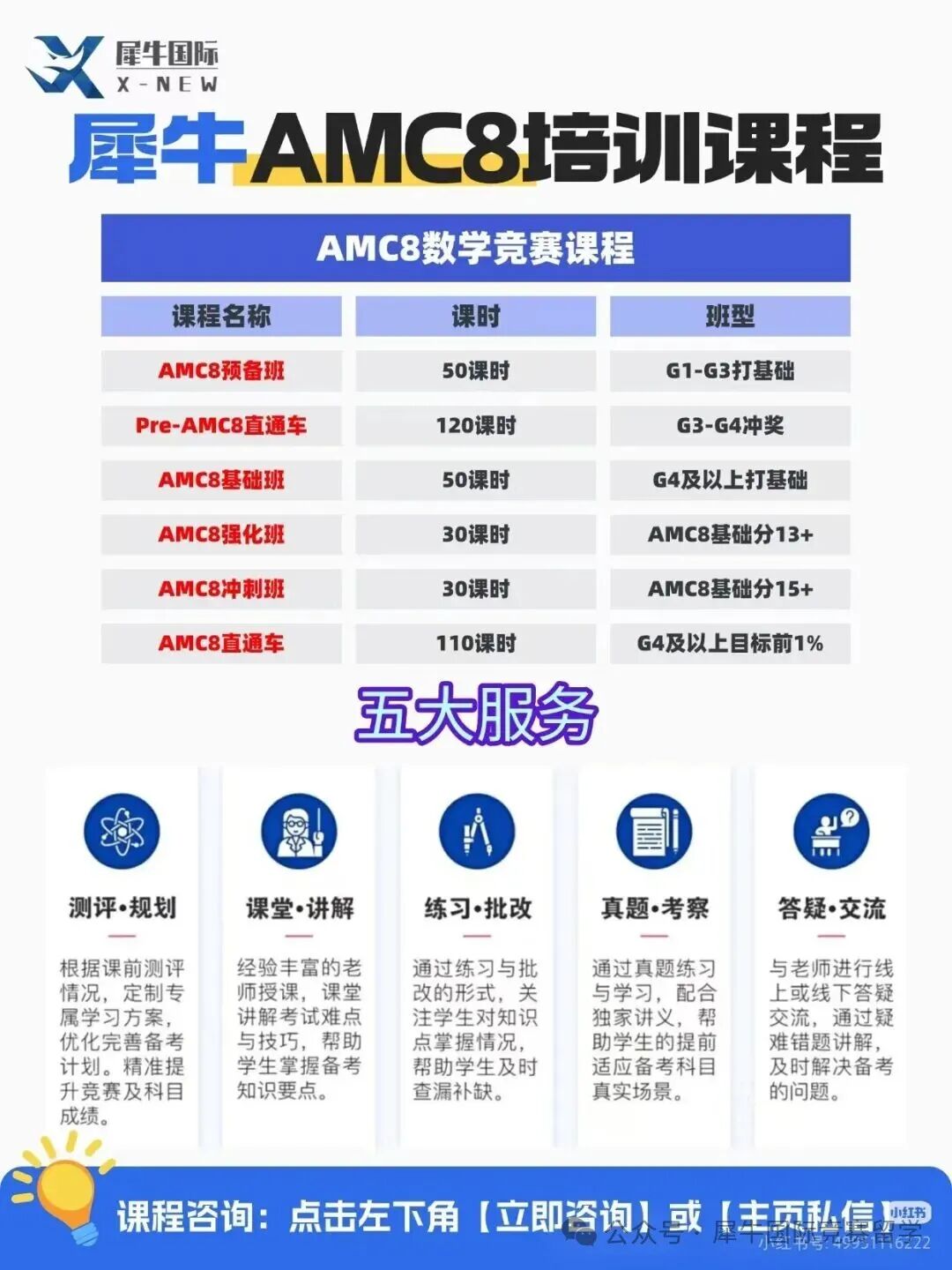 北京AMC8培训课程配套服务:助教1对1批改作业+答疑;专属学习群,学情周报;代报名服务;模考后出具个人错题报告与提分方案