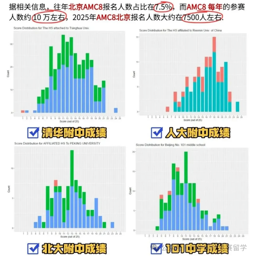 全国基数:AMC8 每年全国参赛约 10 万人,北京地区占比 7.5%,2025 年北京报名人数约7500 人