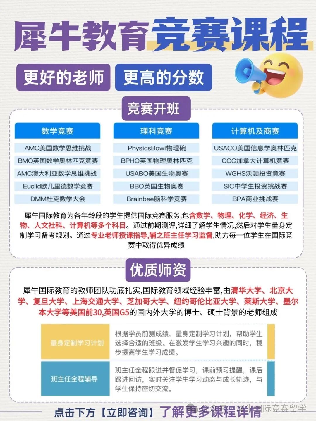 到了初高中,孩子将进入高阶竞赛的冲刺阶段,目标直指全球顶级赛事,为留学申请增添重磅筹码