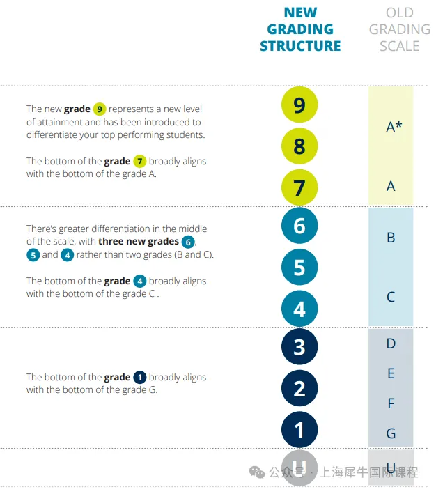 9 - 1 分制:爱德思(Edexcel)和牛津 AQA 考试局采用这一标准,与英国本土 GCSE 一致。其中,9 为最高等级,1 为最低等级,而 U 则代表不及格(unclassified),意味着学生的表现未达到基本要求。