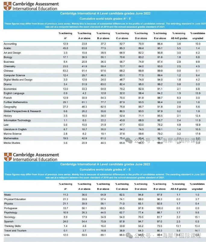 CIE考试局A-Level A*率最高的科目是中文(63.2%),其次是阿拉伯语(45.0 %)、进阶数学(29.1%)和地理(27.2%)。