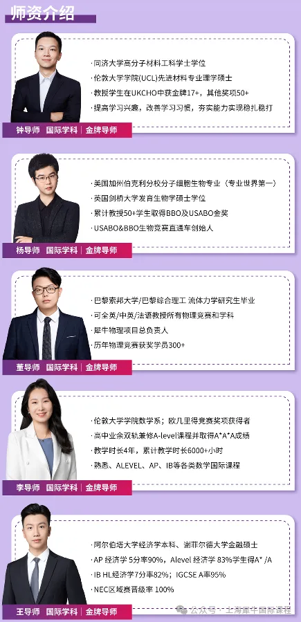 犀牛IG课程主讲老师均毕业于海内外名校:清北复交、伦敦大学、帝国理工等,拥有丰富的国际课程教学经验,熟知国际课程考察重难点。