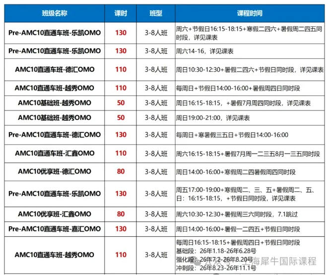 犀牛AMC10竞赛长线系统备考班已经开始,犀牛AMC10全程班110小时包括:基础+强化+冲刺,带你一站式备考。课程时间安排均在平时周六周日,寒暑假,多班级多时段任你选择!