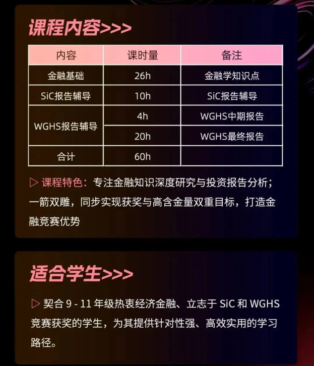适合学生:契合9-11年级热衷经济金融、立志于 SIC和WGHS竞赛获奖的学生,为其提供针对性强、高效实用的学习路径。