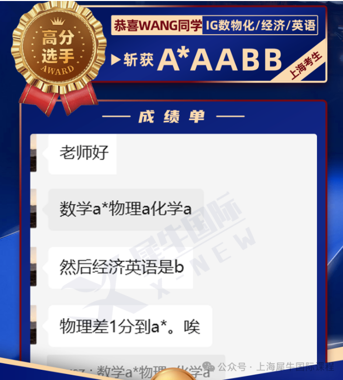王同学IG数学、IG物理、IG化学获得三个A成绩