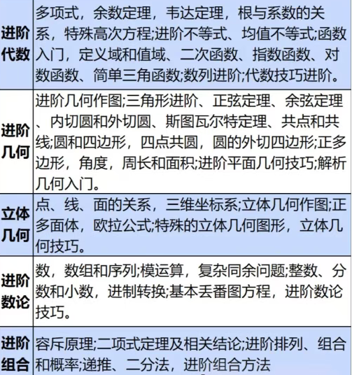 掌握代数、几何、数论、组合四大模块核心内容,保证1–15题基础题基本不丢分。