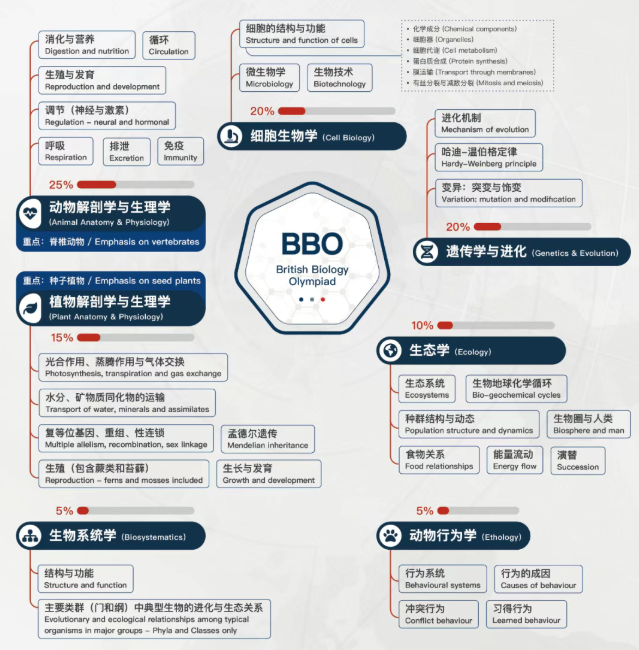 1)知识广度:BBO竞赛覆盖细胞生物学(20%)、动物解剖生理学(25%)、植物解剖生理学(15%)、遗传与进化(20%)、生态学(15%)、动物行为学(5%)七大模块,远超A-Level/IB/AP课内范围,部分内容直接对标大学本科生物难度。