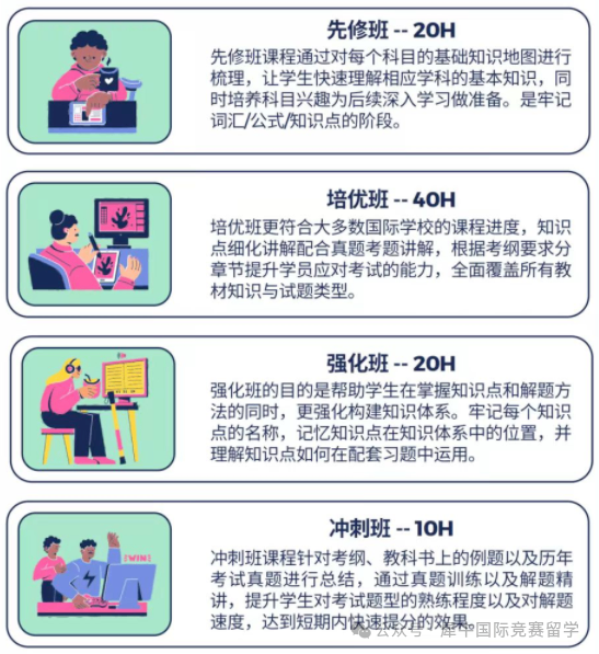 培优班 (40h):紧扣国际学校课程进度,精讲知识点配合真题拆解,分章节提分,全面覆盖考点与题型