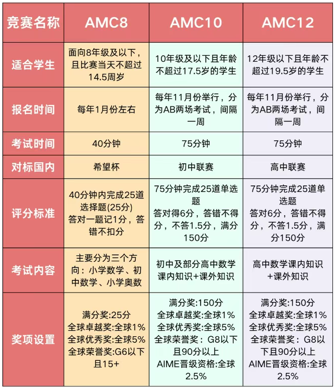 AMC竞赛主要包括AMC8、AMC10、AMC12、AIME,