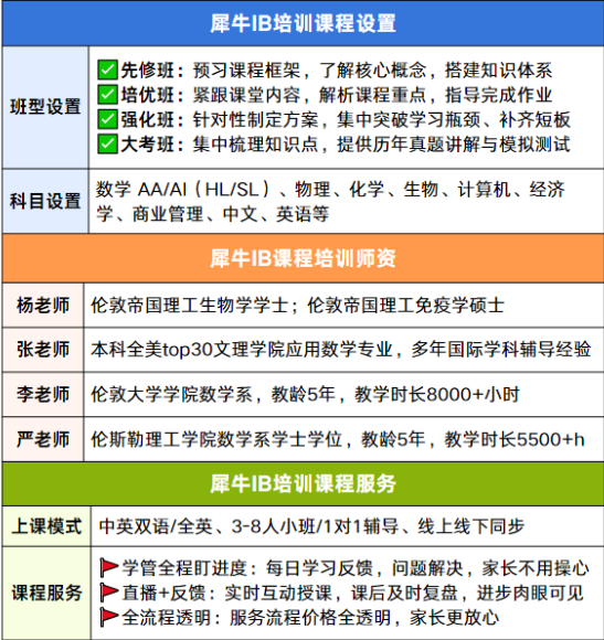 犀牛针对IB大考的学生设置了大考冲刺班,全阶段班型、藤校G5师资、1v1/小班、线上线下同步,覆盖IB全科与全阶段,紧贴最新考纲!