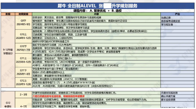 全日制脱产学习A-Level是指学生脱离学校,在专业机构进行全日制的A-Level课程学习与备考。一般来说,以下5类同学比较适合: 1、目标明确,冲刺G5/Top30名校:志在牛津、剑桥、帝国理工等顶尖院校,需要3-4科A*/A成绩,还需兼顾竞赛、科研等背景提升,普通学校的教学节奏难以满足需求,脱产能实现“高分+背景”双重突破。 2、普高转轨国际路线:体制内高二、高三在读,想放弃高考、转向英联邦留学,对Alevel课程体系、考纲完全不熟悉,需要沉浸式学习快速适应,补齐知识断层。 3、国际校在读,成绩不理想:目前在国际校就读DSE\IB课程学生,因为这两个课程要考的科目较多,但学生基础薄弱、跟不上教学节奏,或对学校师资、教学环境不满意,想通过定制化教学精准补漏,实现成绩逆袭。 4、自律性一般,需要外部监督:容易分心、拖延,自学时难以坚持,需要固定的学习环境、专业的督学团队,帮自己养成规律的学习习惯,避免“前松后紧”的备考困境。 5、偏科严重,需针对性强化:部分科目突出(如ALevel数学A),部分科目薄弱(如ALevel物理C),想集中精力攻克薄弱科目,避免偏科拉低整体成绩,影响名校申请。 无论体制内转轨、国际学校转学,还是高考后换赛道,犀牛Alevel培训机构都能提供匹配的Alevel脱产学习计划。 犀牛A-level课程规划服务 犀牛教育1-2年封闭式A-level/AP/IGCSE/IB课程学习,规划+辅导+背提+升学。精细定制管理,一人一课表+一人一IP; 入学测试和规划:通过入学测试了解学生基本学习成绩和情况;选课和考试,确定大致综合排名院校;日常课程安排,确定报名时间及相关课程进度规划。 语言提升:全日制雅思课程,学术英语早读,针对留学申请的雅思 7.0 冲刺班,小班教学提分快; 背景提升:专属竞赛规划,AMC8/10/12、BPHO、UKChO、BBO 等高含金量竞赛全程辅导,拿奖率高; 留学申请:专业规划师从选校、文书撰写到 UCAS 递交、签证办理全程跟进,根据学员成绩和背景精准定位,不盲目冲校。
