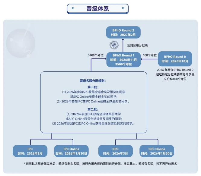 没赶上BPhO前置赛(IPC/SPC)的同学们也先别遗憾!通往BPhO的末班车票已经补发——只要你在BPhO Round 0中突破高分线,就能直接抢占仅有的100个独立预留考位!2026年BPhO Round 1全球仅开放3500席,名额分配机制如下: