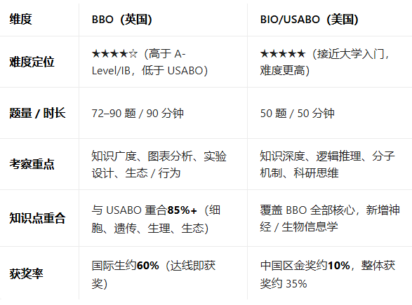 英美双申最优解:同时提交 BBO+USABO/BIO成绩,不仅覆盖英美两大体系,还能展现全球学术竞争力,毕竟奖项组合起来会更有说服力。