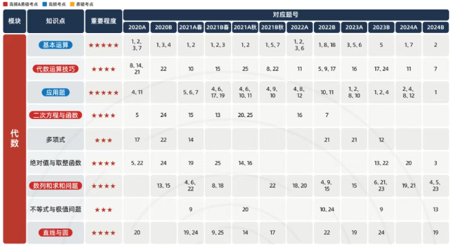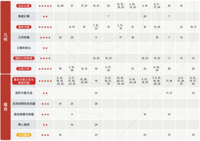 除了基本知识点的补齐,对重点难点知识也要有针对性的提升,除了保证基础前15道题没有失误之外,需要攻克难点和高频考点,结合近5年的amc10考试规律,思客amc团队总结出教研代数、几何、数论、组合和概率几大模块的高频知识点、重要考点和难点,大家可以对照学习。