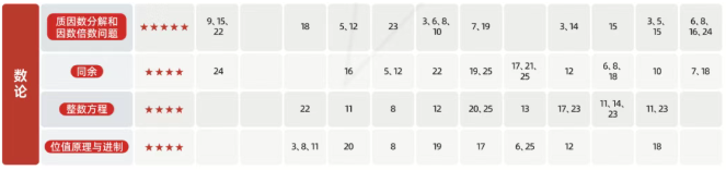 数论(Number Theory):数论模块占比约为 20%–25%。这部分内容在国内课程中较少涉及,是拉开差距的关键模块。