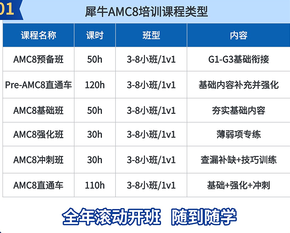 犀牛国际教育AMC8课程线上线下同步,分阶教学科学分班,适配各类基础,助力小升初孩子高效备赛、稳稳拿奖。