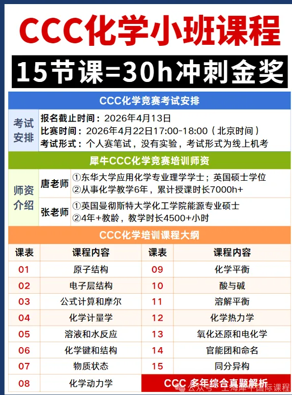 CCC加拿大化学竞赛,含金量比肩UKChO的王牌赛事,不仅是CCO加拿大化学奥赛的官方预选赛,更以友好难度、高获奖率成为中国学生的 “学术加分利器”!CCC化学即将考试,考前这些高频考点一点要掌握!考试冲刺指南来了~