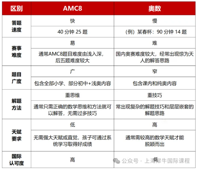 在北上广等一线城市很多鸡娃家庭都让孩子学习奥数,然而,奥数学习并非适合所有孩子。近几年,AMC8数学竞赛在国内越发火热,在犀牛教育参加培训的很多孩子家长已经转换思路放弃奥数,让孩子转战学习AMC8竞赛。部分家长还不知道AMC8和奥数有什么区别?应该如何选择?