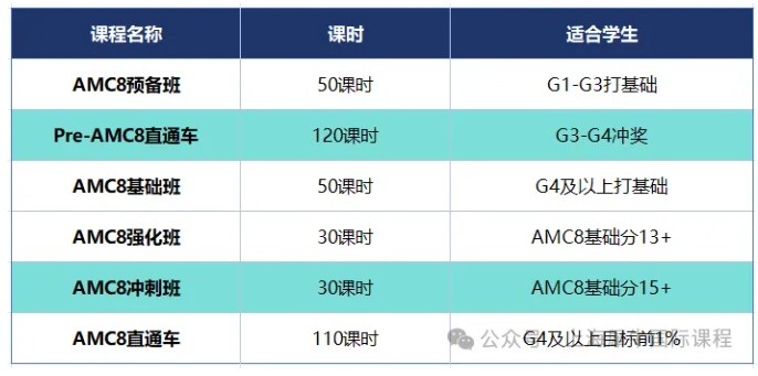 50小时,适合初次备考AMC8竞赛的学生,初步建立AMC8知识体系,补充AMC8竞赛知识点。