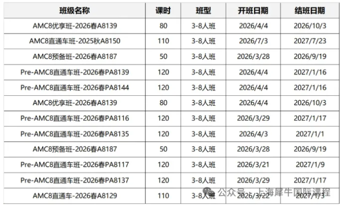 犀牛AMC8科学分层教学,针对不同年级、不同基础的学生,推出AMC8预备班、Pre AMC8直通车、AMC8直通车、AMC8基础班、AMC8强化班、AMC8冲刺班等班型,基础薄弱的同学们可选择AMC8直通车系统学习,长线备考!
