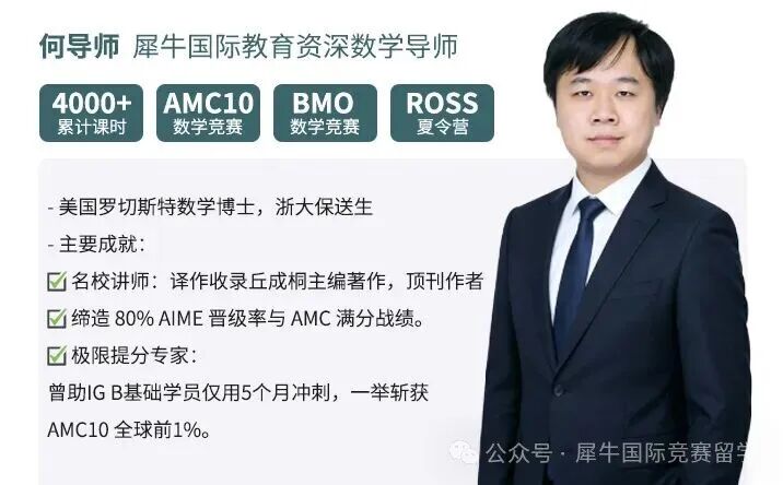 由犀牛资深数学何导师亲自授课,美国罗切斯特数学博士、浙大保送生,累计授课 4000 + 小时,缔造过 AMC 满分战绩,更曾帮助 IG 基础学员 5 个月冲刺拿下 AMC10 全球前 1%,精准把握学生薄弱点,高效提分!