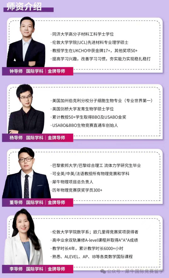 犀牛 A-Level 课程师资团队均毕业于海内外顶尖院校,深耕国际课程体系多年,对 A-Level 考试大纲、评分规则与命题规律有精准把握;同时深谙不同学生的学习痛点与薄弱环节,能够量身定制适配性教学方案,实现高效提分!